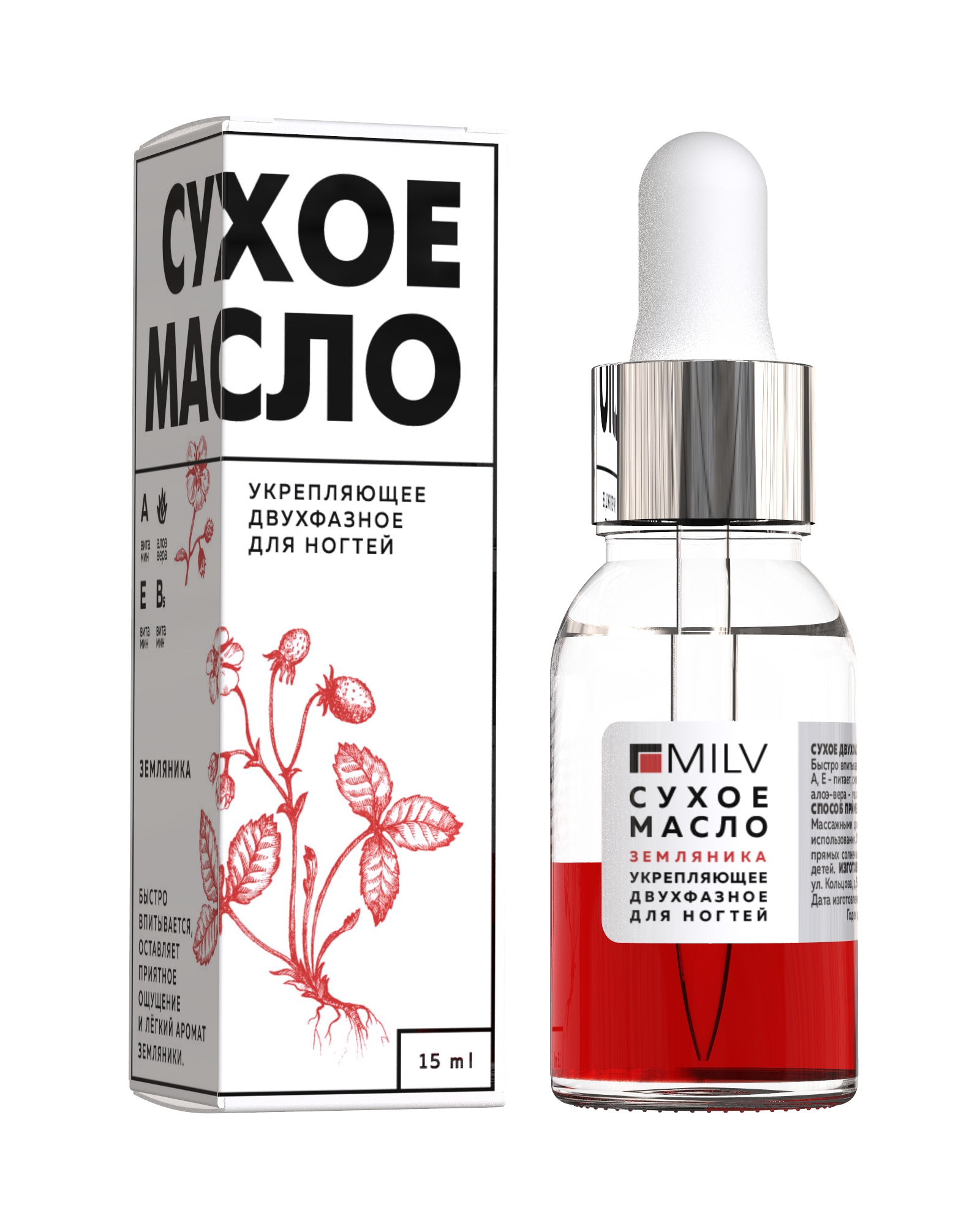 Сухое двухфазное масло для ногтей «Земляника». 15 мл. Milv